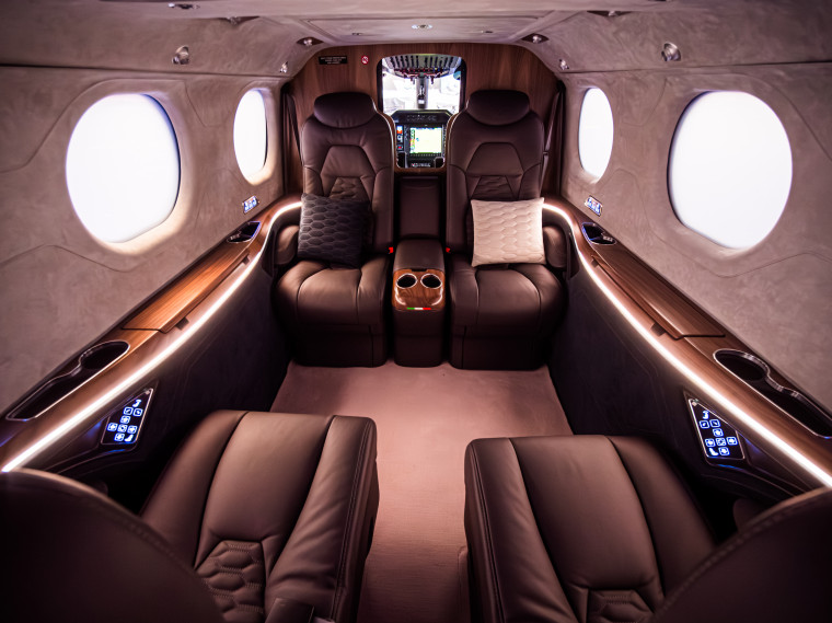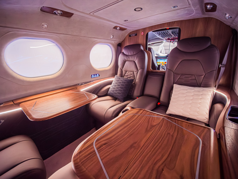 Cabina exclusivă, configurată pentru șase locuri, este finisată cu piele naturală cusută manual. Zona centrală oferă o configurație tip „club” cu patru locuri și spațiu generos pentru picioare, completată de două scaune executive orientate spre direcția de zbor.