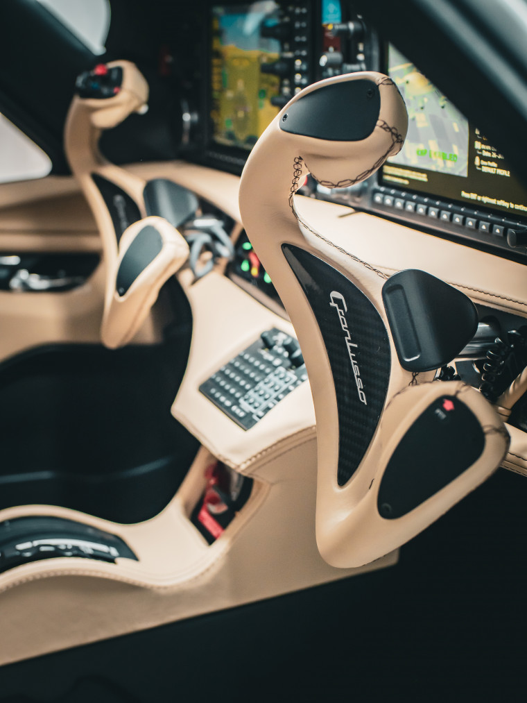 Cabina Gran Lusso este o experiență în sine. Scaunele sunt îmbrăcate în piele naturală de înaltă calitate, cusută manual, cu perforații fine și detalii contrastante ce se aseamănă mai degrabă cu interiorul unui automobil italian premium decât de o aeronavă de aviație generală. Panourile laterale, bordul și elementele decorative sunt finisate cu materiale premium, iar fiecare detaliu – de la mânerul ușii până la cusăturile de pe cotiere – reflectă grija pentru estetică specifică designului italian.